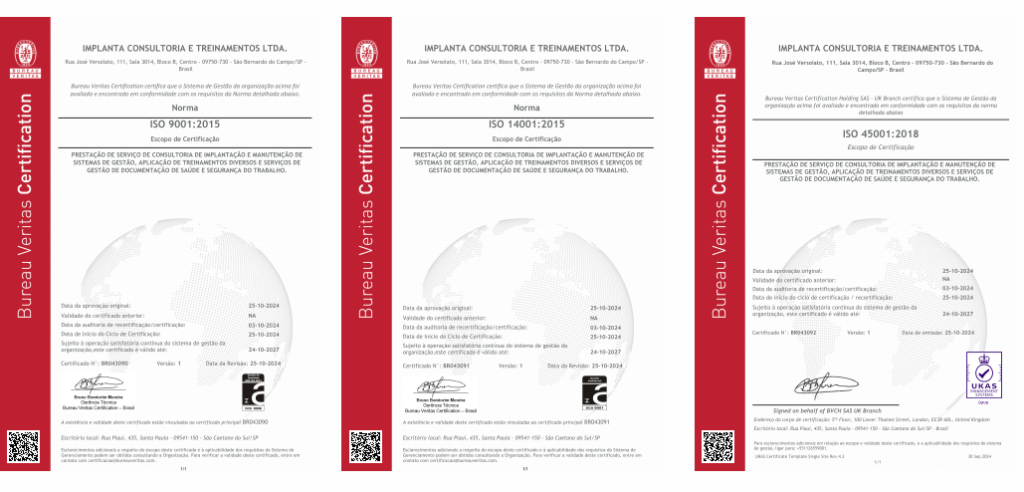 A Implanta Consultoria é certificada pela Bureau Veritas nos sistemas de gestão ISO 9001:2015 (Qualidade), ISO 14001:2015 (Meio Ambiente) e ISO 45001:2018 (Saúde e Segurança Ocupacional). Esse reconhecimento internacional valida nossos processos, a padronização e melhoria contínua, e a conformidade legal que levamos aos projetos de nossos clientes — do diagnóstico à auditoria de certificação.